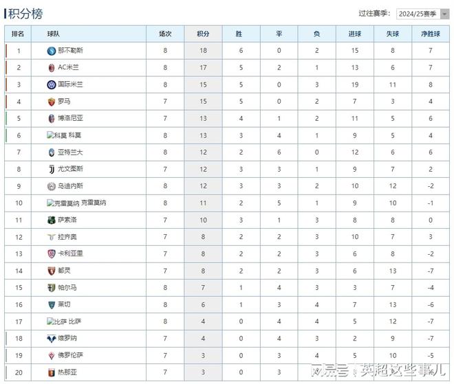 意甲最新积分榜:那不勒斯力克国米登顶,亚特兰大保住不败金身!
